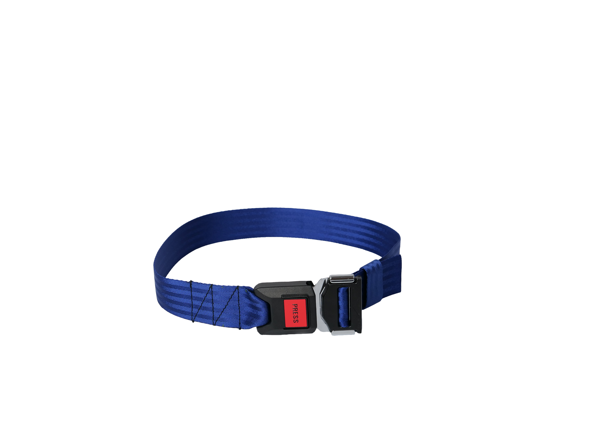 Sicherheitsgurtband gefertigt ist und mit einem praktischen Pressschloss