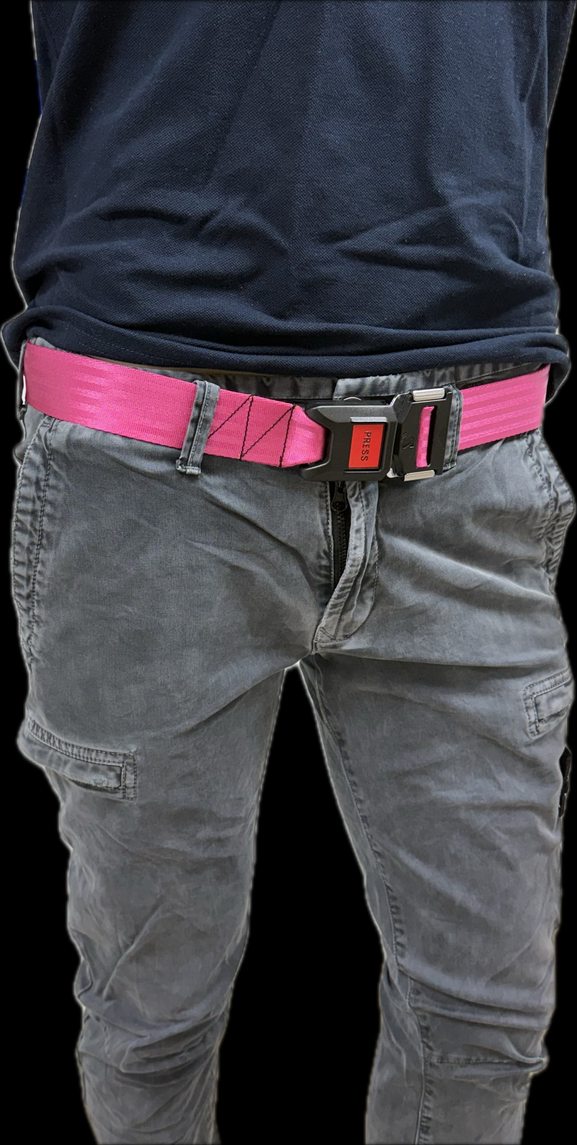 Sicherheitsgurtband gefertigt ist und mit einem praktischen Pressschloss