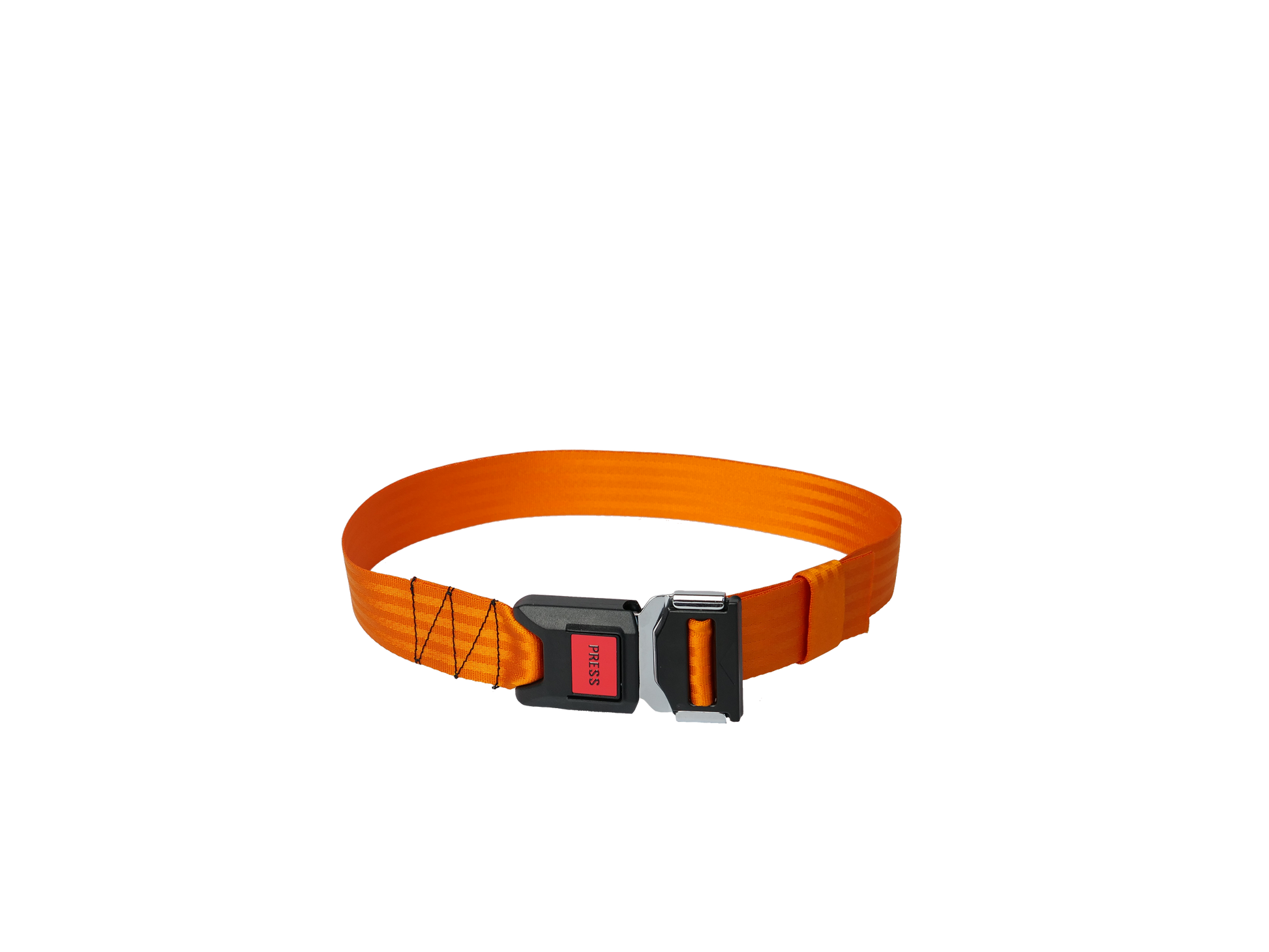 Sicherheitsgurtband gefertigt ist und mit einem praktischen Pressschloss